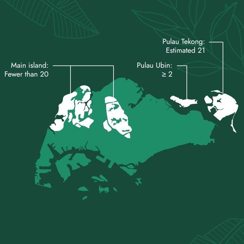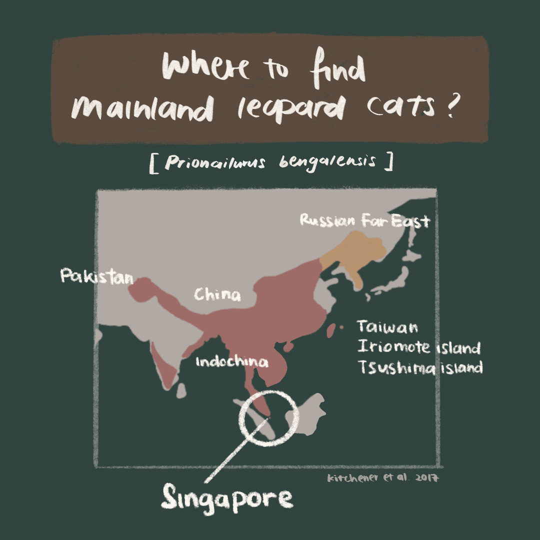 Research (Chua et al., 2016) identifies Pulau Tekong as a stronghold for this wildcat, and that they are also found on Pulau Ubin (Fung et al., 2017). On mainland Singapore, leopard cats are found in the Western Catchment Area and in the Central Catchment Nature Reserve (Chua, 2015; Chua et al., 2016). It is believed there are about 50 individuals altogether.